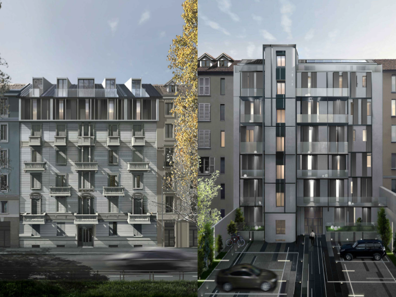 The original building at Via Cenisio 81 is a six-story structure rich in concrete decorative features, built around 1910, blending past and future elements today.