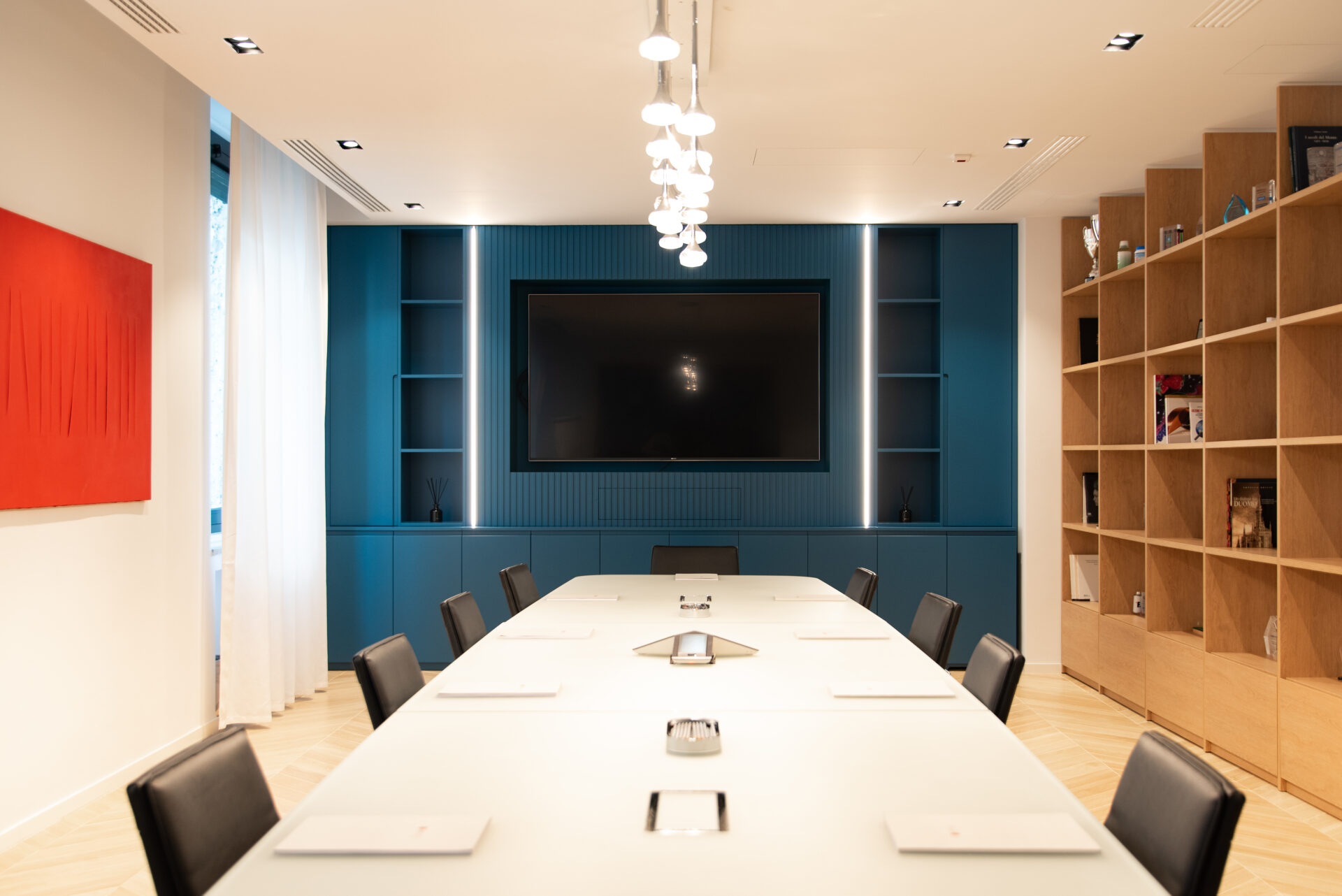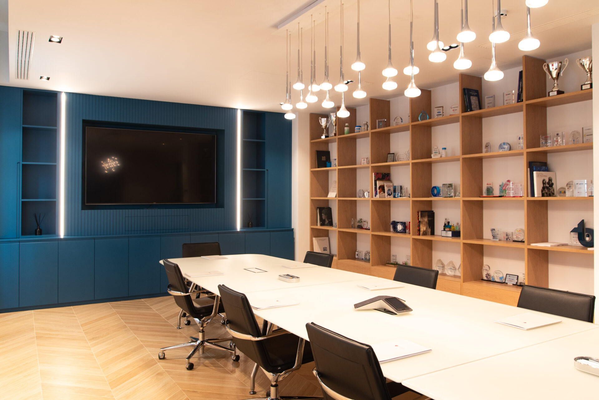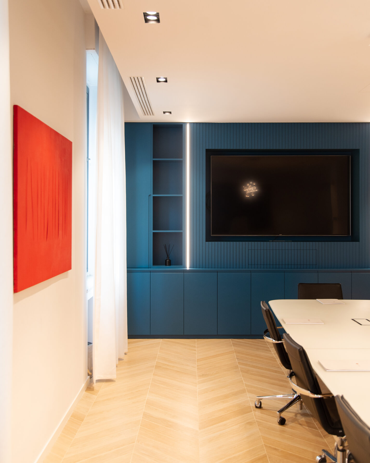The intervention involved creating new internal space divisions for offices, with particular attention to updating electrical, mechanical, and special systems in line with the new layout. The modifications included demolishing gypsum board and masonry walls and removing veils and suspended ceilings. The raised floor was adapted to improve the functionality of the environments, while the installation of glass and gypsum board walls defined the new spatial configuration. The interior design was completed with premium finishes and carpentry work, reflecting a high-quality work environment.